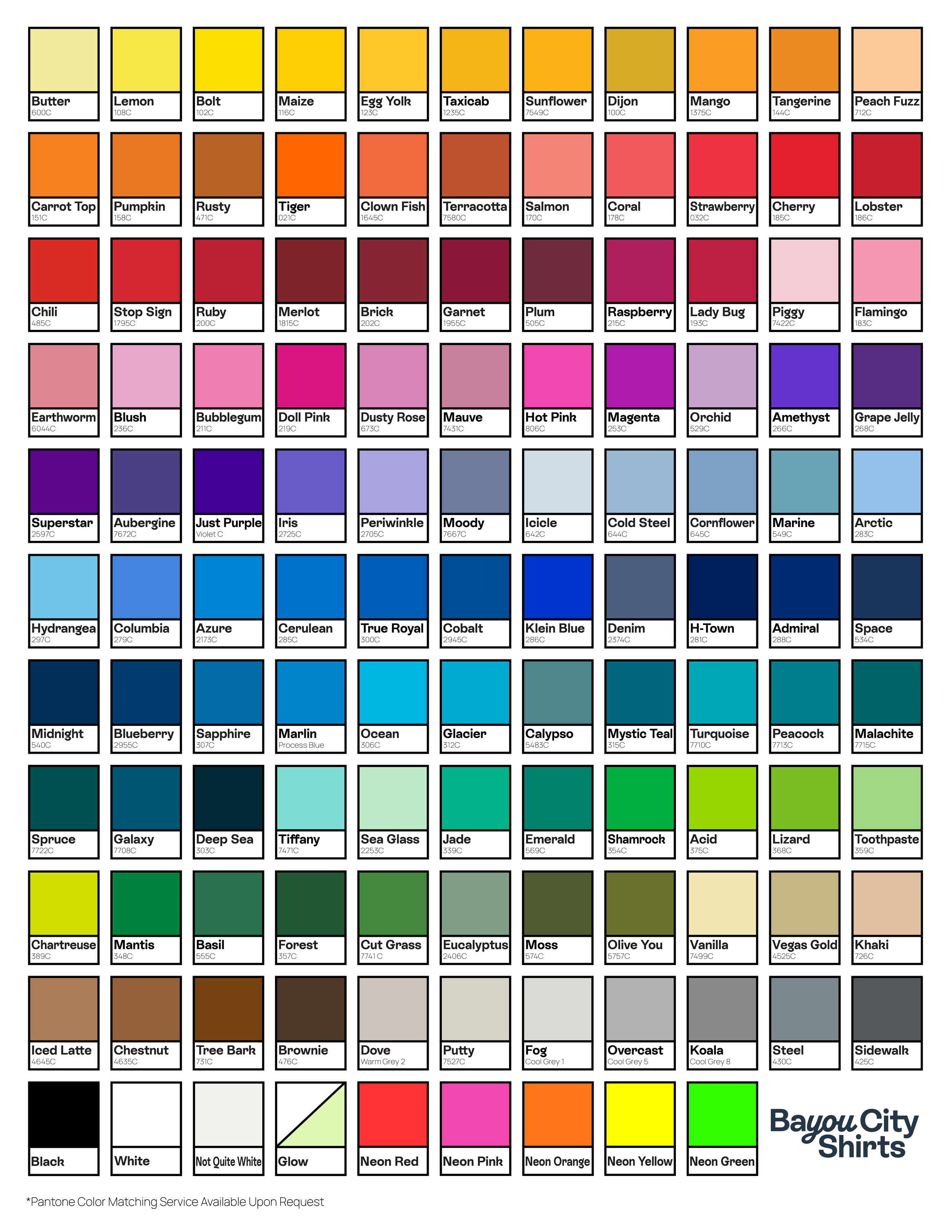 Choose from 120+ always-in-stock plastisol inks to bring your brand or custom merch to life!
